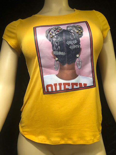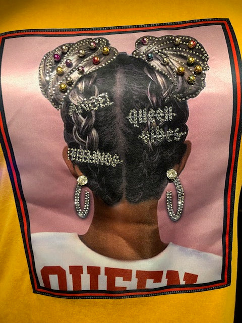Comfy cotton T-Shirt with picture of the back of a girl with 2 high buns and lots of flashy hair jewelry.
